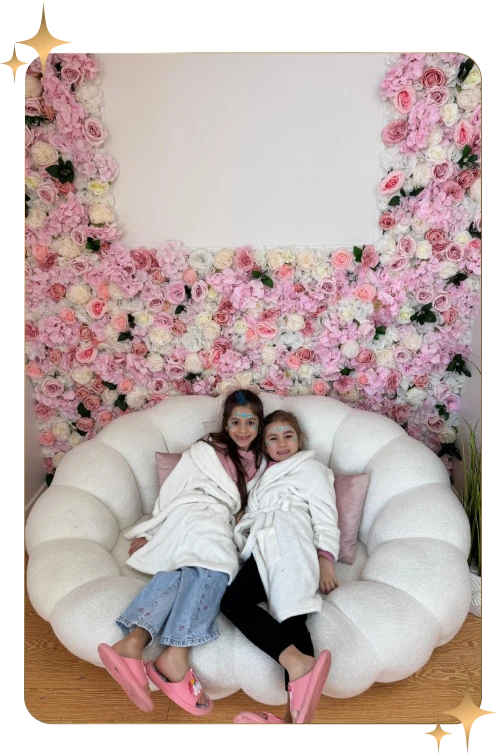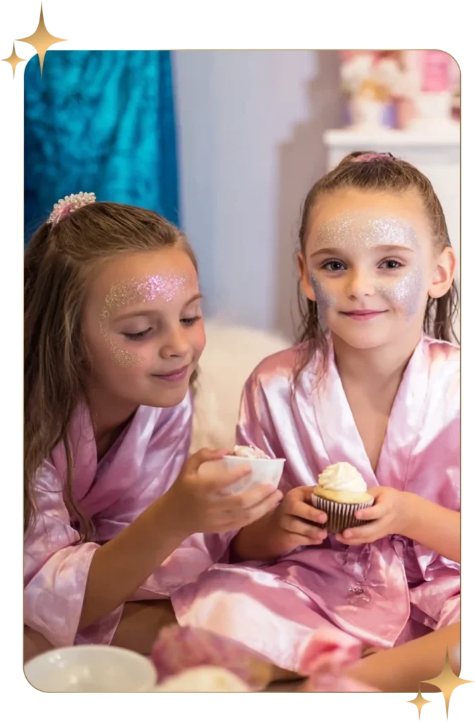 Each guest receives a natural-nail mani-pedi with hand-cream massage, a soothing fresh-cucumber facial mask, face & hair glitter, glitter tattoos, professional hair styling and a mini photoshoot. To top it off, enjoy a gourmet cupcake & soft drink, and take home a Sparkly loot bag—all fully supervised for your peace of mind.
